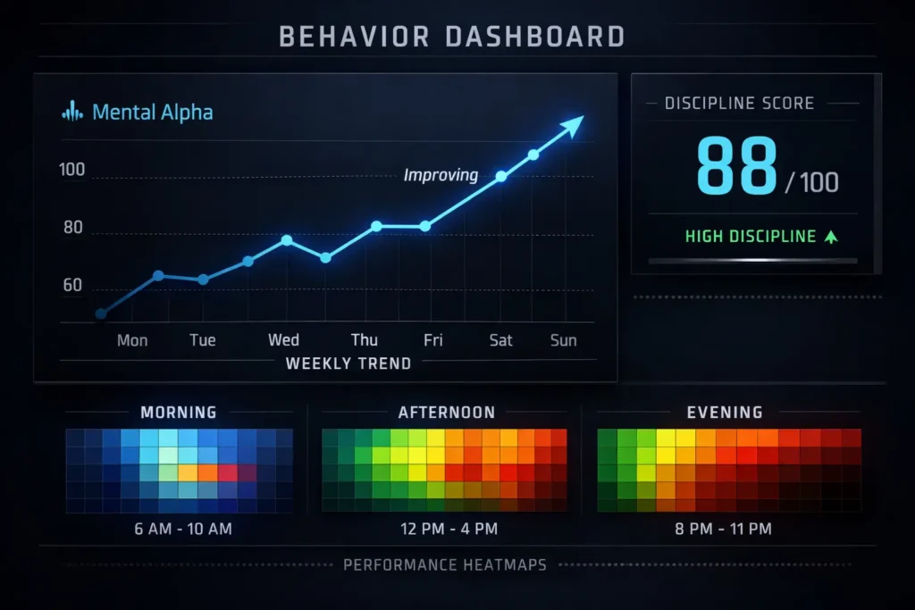 Track your Mental Alpha with Discipline Score, Patience Rating, and Consistency trends.
