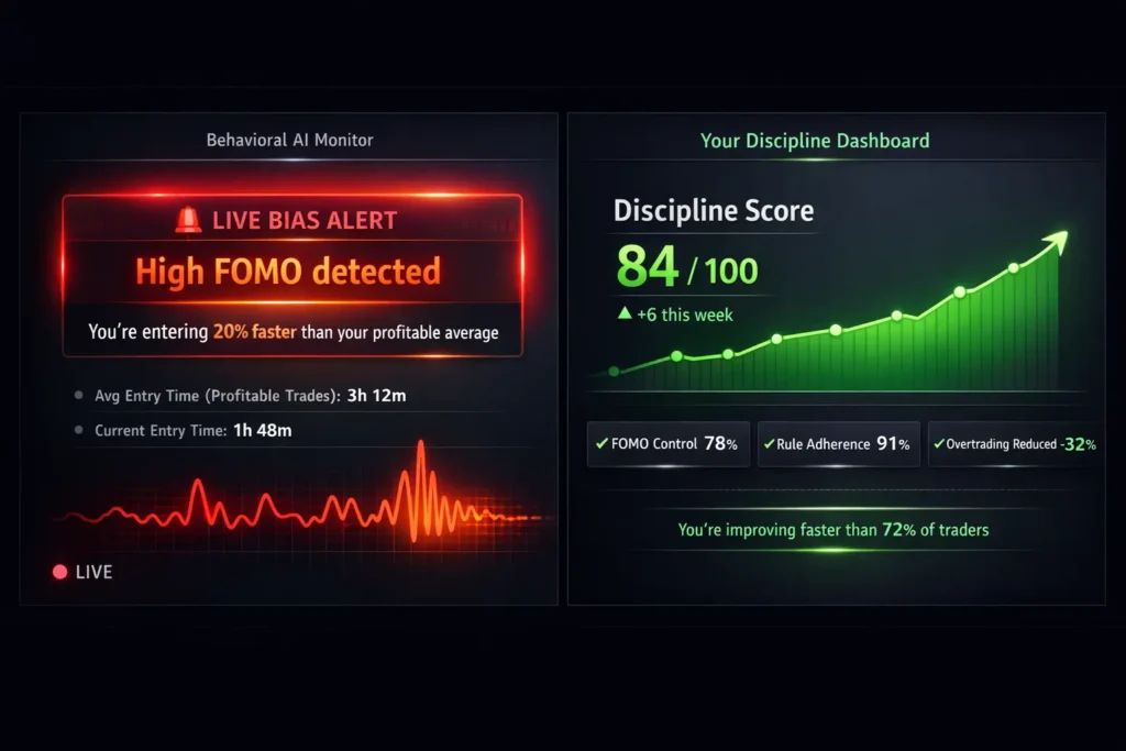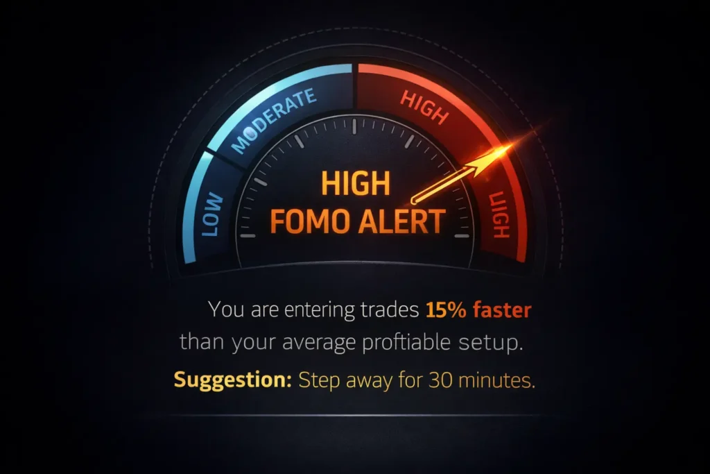 Real-time alerts flag FOMO, Revenge Trading, and Overconfidence.